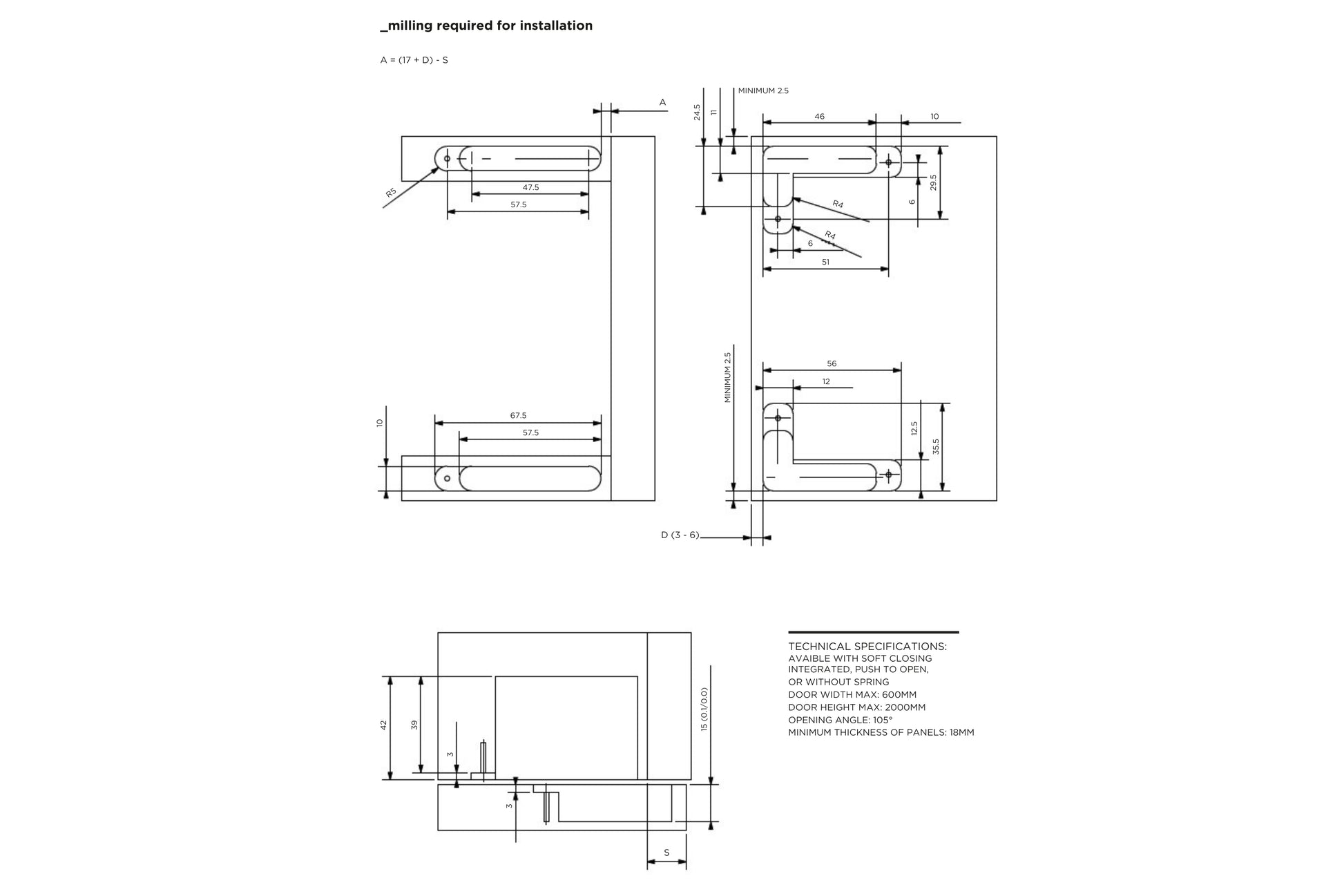 Soft closing recessed hinge for aluminium S profile 20kg or wooden doors.