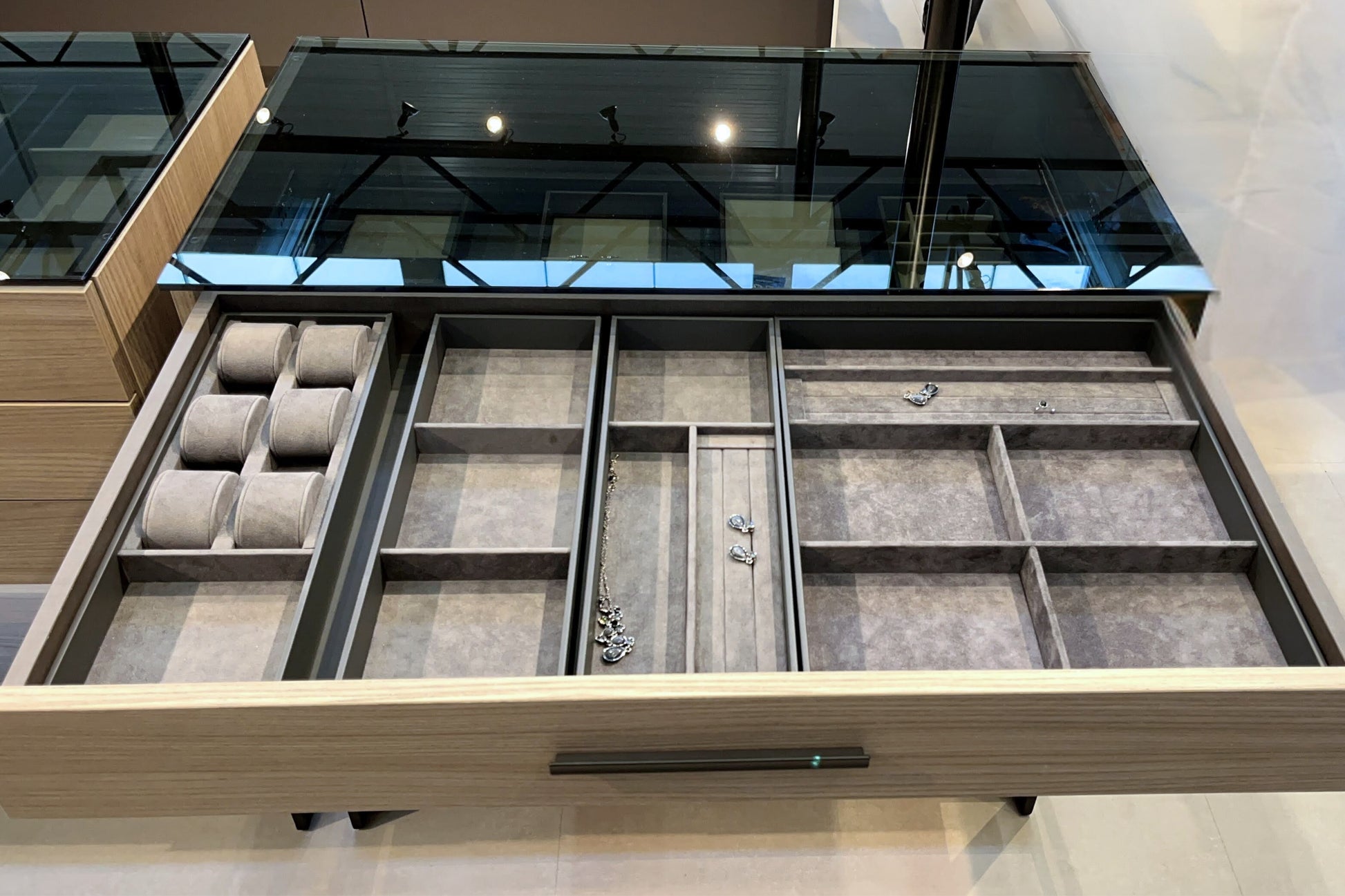 The outer box is hand-wrapped in luxurious simil leather, while the inner partitions are lined in soft velvet, providing a stylish and protective home for your valuables.